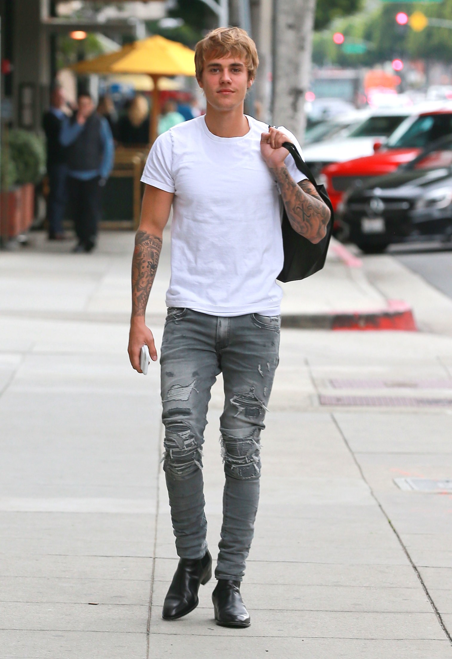 Poppstirnið Justin Bieber sást á dögunum í Beverly Hills í hælum og þröngum gallabuxum og aðdáendur furða sig á hvert víðu gallabuxurnar, hettupeysan og strigaskórnir fóru. Hann var í þröngum hvítum bol, gallabuxurnar rifnar og svörtum skóm sem ætla mætti að Kendall Jenner eða Gigi Hadid myndu klæðast frekar en hann. Að því sögðu líður hann afar vel út!