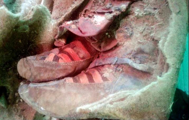 Aðeins fundust leifar af hand- og fótleggjum en það var nægilegt til að koma af stað sögusögnum á netinu. Af hverju? Jú, því skórnir virðast bera hið heimsþekkta þriggja randa Adidas lógó. Fyrsta parið af Adidas skóm leit dagsins ljós árið 1949, þannig það er ekki líklegt! Sumir virðast hneigjast til að trúa á tímaflakk vegna þessa merka fundar.