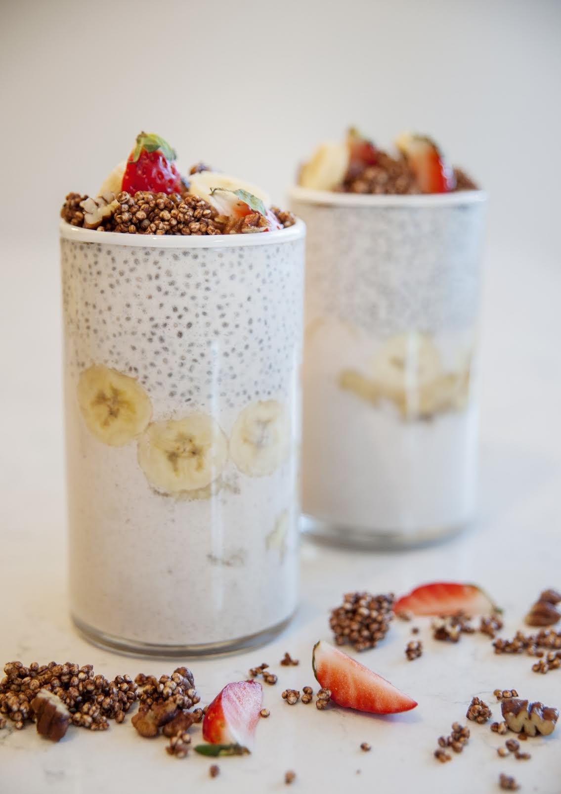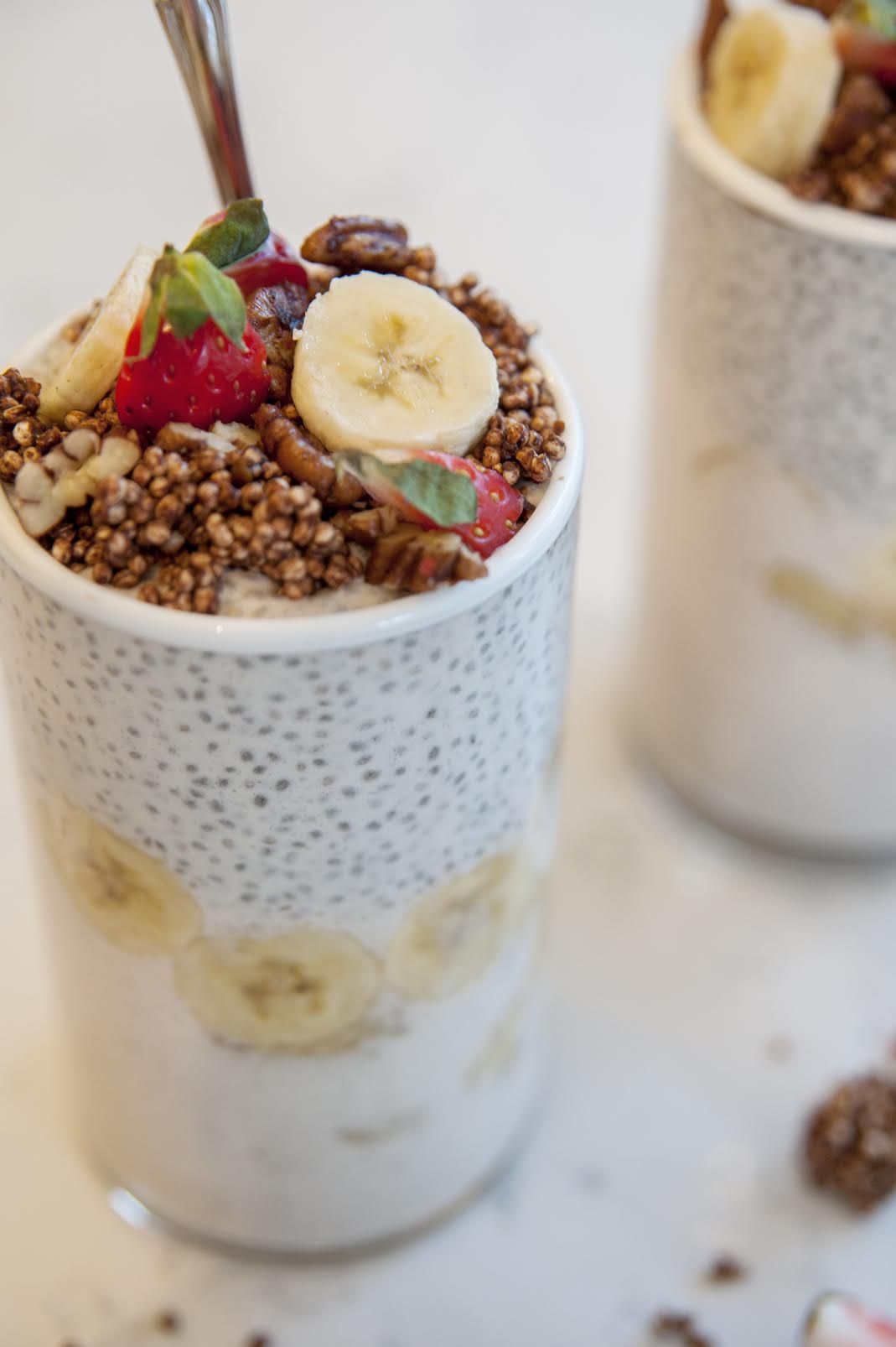 3. Sameinið chiagrautin með því að hella chai rjómanum í tvö glös c.a 1/3 glasins, þar ofaná bananastappa eða banana sneiðar, fyllið glasið svo með chia- og bananagrautnum og skreytið með súkkulaðikúlum, Chai kryddaðuðum pecanhnetur og jarðaberjum. Njótið strax!