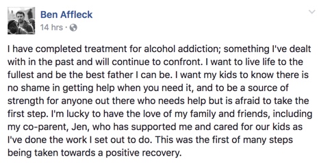 Ben Affleck skrifaði afar hjartnæma færslu á Facebooksíðu sína til að láta aðdáendur vita að hann hefði nýlokið áfengismeðferð. Ben, sem er 44 ára, segist hafa átt við áfengisvanda að stríða áður og muni hafa um ókomna tíð. Í færslunni þakkar hann vinum og fjölskyldu, m.a. barnsmóður sinni Jennifer Garner leikkonu fyrir allan stuðninginn og vill hann að börnin sín viti að engin skömm sé fólgin í því að leita sér hjálpar.