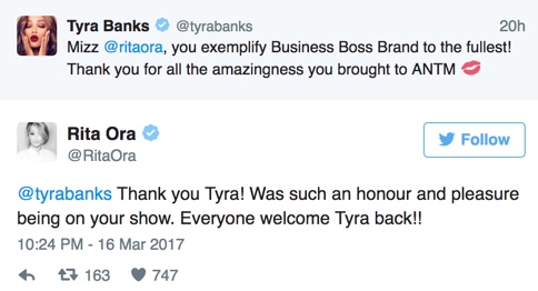 Til að sýna öllum að enginn kali væri milli Tyru og Ritu (og koma í veg fyrir slúðursögur) skiptust þær á tvítum: