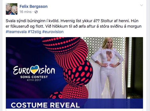 Felix Bergson, kynnir, getur ekki haldið aftur af spenningnum sem ríkir fyrir Eurovision þessa dagana og er stoltur af henni, en Svala tekur þátt í undankeppninni þann 9. maí næstkomandi. Hann spyr á Facebook: