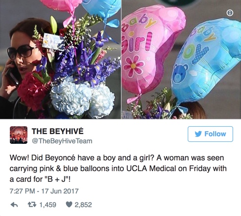 The Bey Hive, aðdáendaklúbbur Beyonce telur sig hafa ráðið gátuna: Kona sást fara inn á spítalann með bleika og bláa blöðru og kort sem á stóð: „Til B og J“