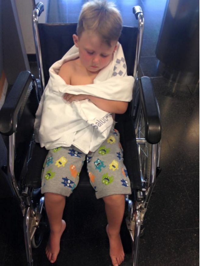 Móðir Jack Collins, fimm ára drengs, fékk áfall þegar hún reyndi að klæða son sinn úr sundbuxunum eftir venjulega sundferð í sumarfríi. Þau komu frá lauginni og hún ætlaði að hjálpa honum úr þegar hann öskraði hátt: „Hann öskraði svo, ég hafði aldrei heyrt annað eins. Engin móðir vill heyra slík öskur,“ segir Laura Collins.