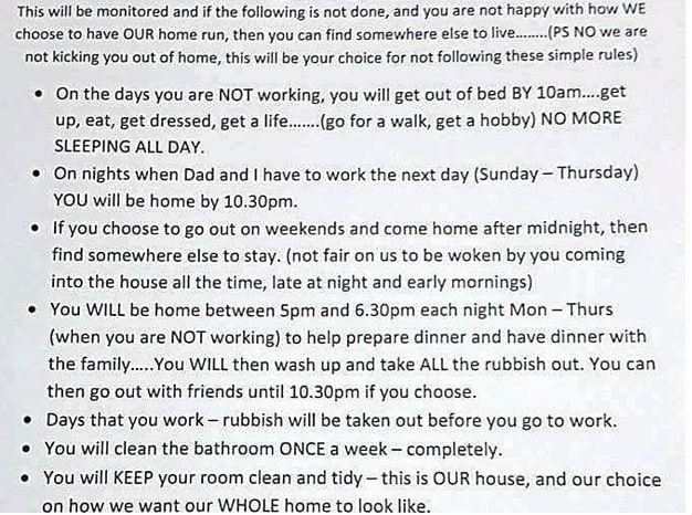 Móðir nokkur í Ástralíu birti húsreglur fyrir 18 ára dóttur sína á netinu og hafa þær vakið mikla athygli og finnst mörgum móðirin vera heldur ósanngjörn.