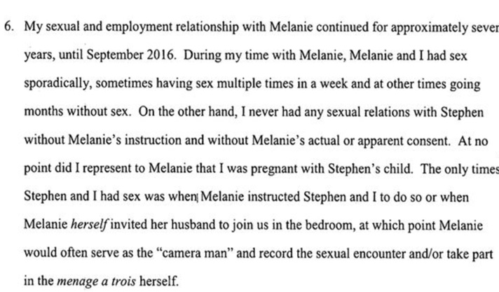 Í dómssal sagði Lorraine frá því að þau hafi notið kynlífs, öll þrjú: „Kynferðissamband mitt við Melanie stóð yfir í um sjö ár. Við stunduðum kynlíf öðru hvoru, stundum oft í viku. Ég átti ekki í kynferðissambandi við Stephen nema með leyfi Melanie og var hún þá viðstödd. Hún sagði okkur hvað við ættum að gera. Eða þegar Melanie bauð Stephen að vera með okkur í rúminu og annaðhvort tók hún kynlífið upp eða var með okkur.“