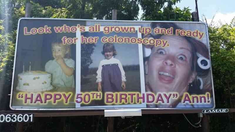 Sumir óska manni til hamingju með afmælið…svo eru það hinir sem kaupa auglýsingaskilti og segja Ann að hún sé nú tilbúin að fara í ristilspeglun