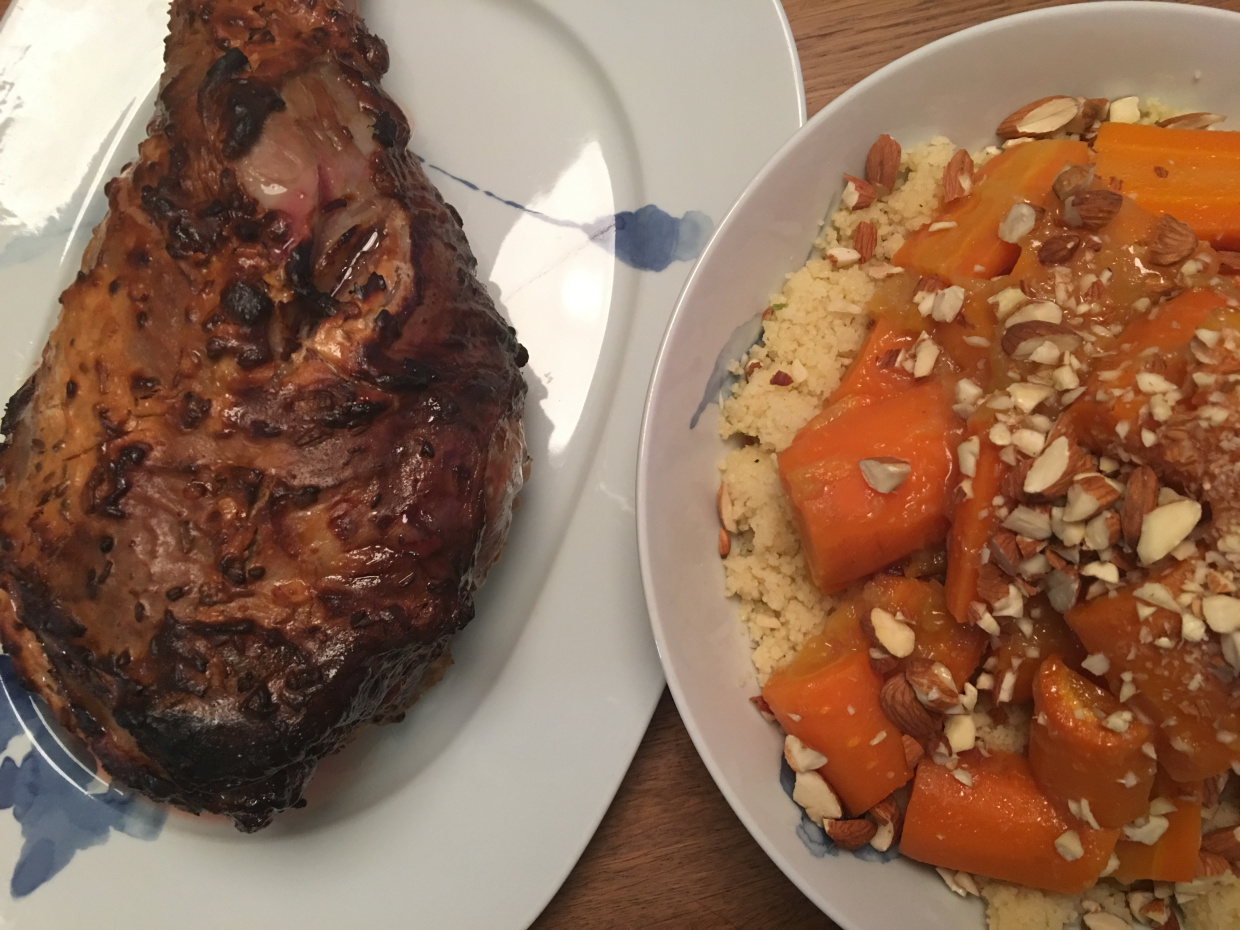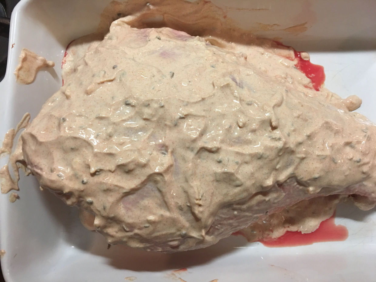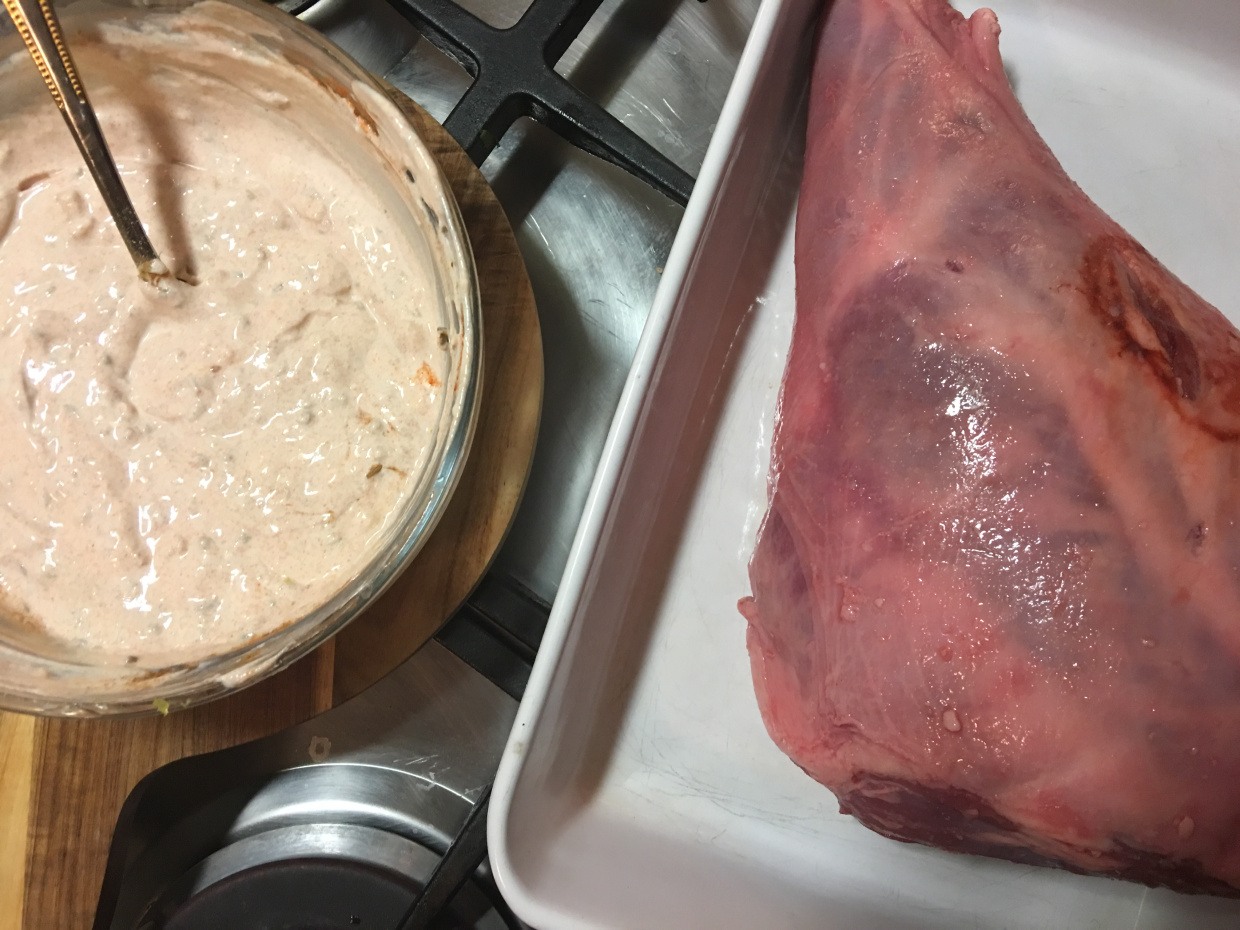 Sigurveig Káradóttir skrifar: Lærið var í smærra lagi – 1,7 kíló. Það kallaði á marineringu í jógúrt og góðum kryddum og ég ákvað að láta það eftir því. Og sé ekki eftir því. Jógúrtblandan var mild og góð – endilega smakkið hana áður en hún fer á kjötið og setjið aðeins meira af því sem ykkur langar. Mér fannst hún passleg svona, en öll krydd eru misjöfn og smekkur manna þannig að….aðeins meiri papriku? Aðeins meira kúmen? Látið vaða!