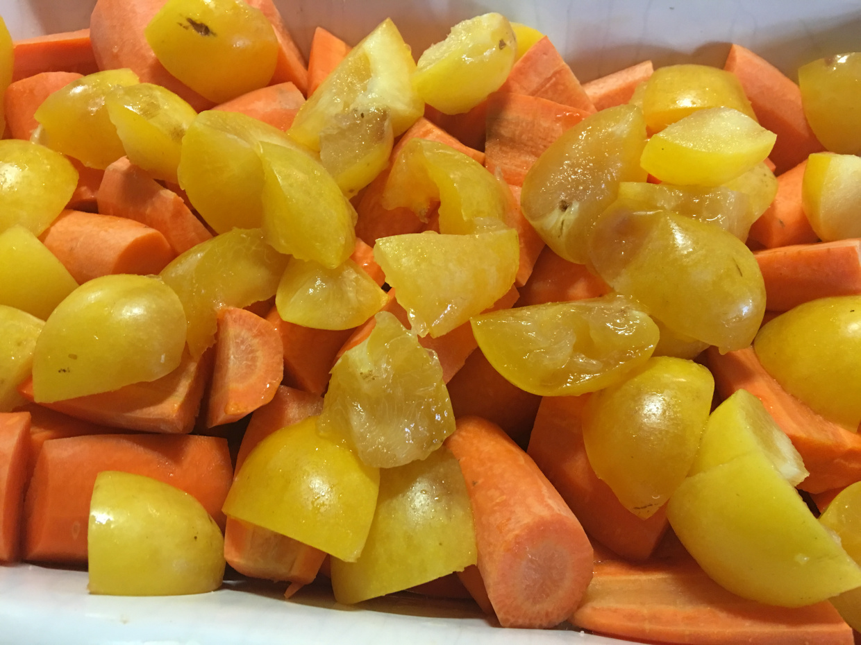 Ég skar þær í fremur stóra bita, setti í fat ásamt vatni, sjávarsalti, ólívuolíu og hunangi. Nægilegu vatni til að þekja botninn, sirka 1/2 tsk af sjávarsalti, 4-5 msk af ólífuolíu og 3-4 tsk af hunangi. Mældi ekki nákvæmlega, heldur bara með auganu sem er í mörgum tilfellum besta og nákvæmasta mælieiningin.