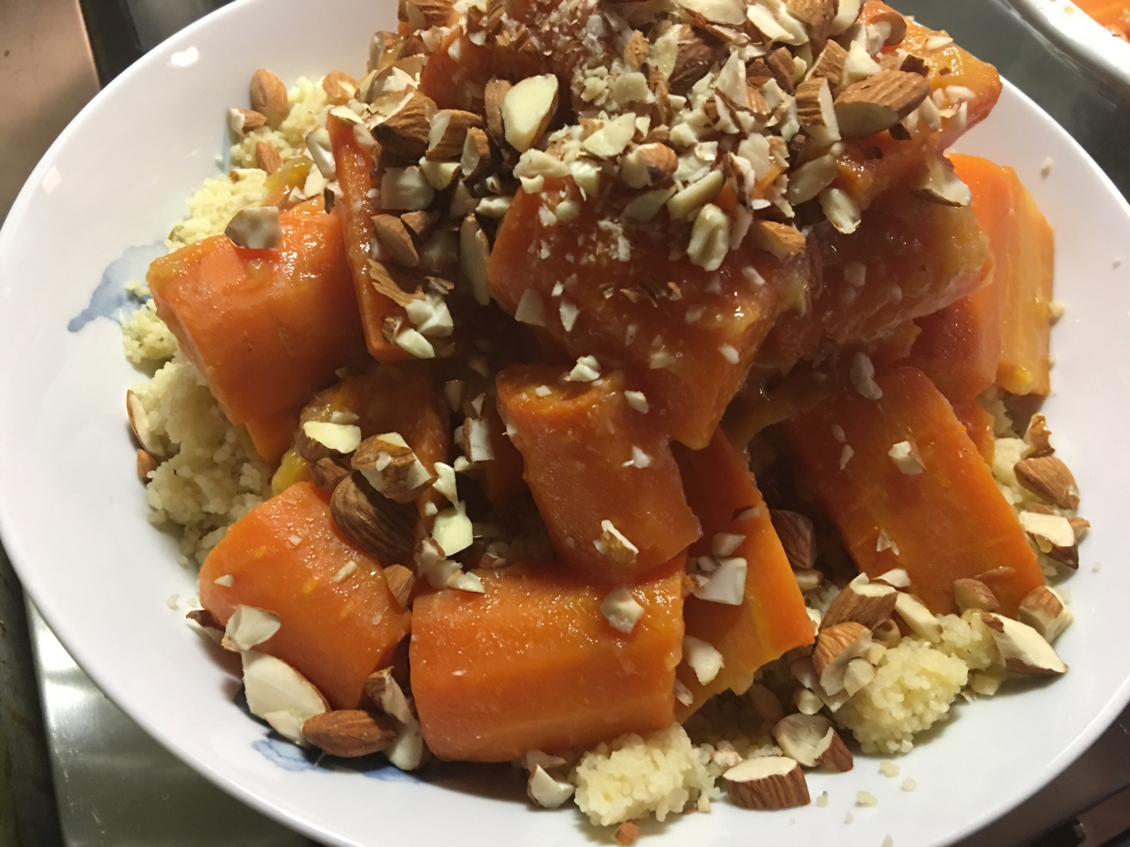 Plómurnar bráðna alveg og verða að góðri sósu sem gott er að hella á kús kúsið. Þannig að ef þið sjáið engar plómur í fatinu þegar þið takið það út – ekki fá sjokk. Það á að vera þannig! Þær eru bara þarna til að verða að sósu. Það er þeirra hlutverk í þessu tilfelli. Og ef engar eru plómurnar, þá er tilvalið að taka nokkrar þurrkaðar apríkósur og skella í fatið í staðinn. Skera þær bara nokkuð smátt en ekki of – þær drekka í sig mikinn vövka og eru ansi góðar með gulrótum og kús kúsi.