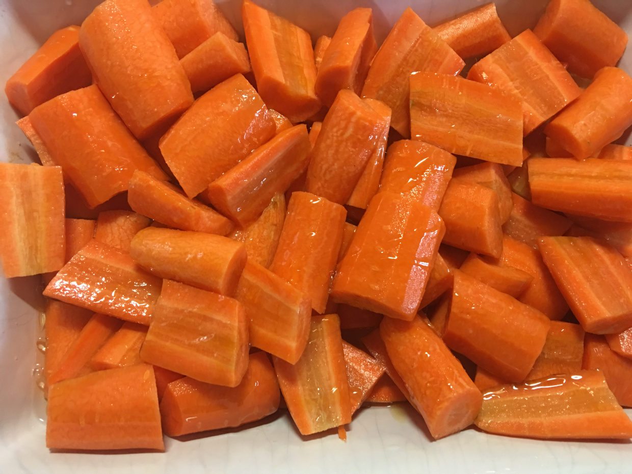 Það fór töluverður slatti af gulrótum í fatið – næstum 2 kíló sem er kannski heldur í meira lagi sem meðlæti, en þar sem ég var nokkuð viss um að þetta yrði gott og góð undirstaða í hádegismat næsta dag….