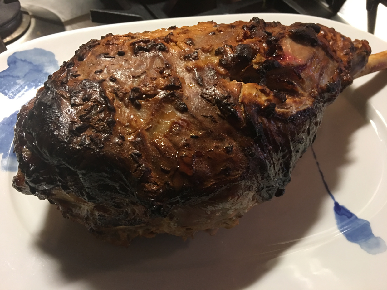 Lærið fór fyrst inn á 250 gráðum í 20-30 mínútur, lækkaði síðan í 200 gráður í kannski klukkutíma og loks í 180 gráður þarna fyrir rest. Var inni í rúman einn og hálfan tíma en hefði vel mátt dóla sér aðeins lengur.
