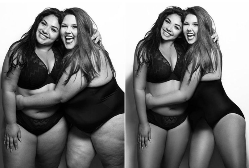 Myndin er af þeim tveimur fyrir og eftir vinnsluna. Callie, sem er í stærð 24, segir að engin furða sé að konur séu óöruggar með sig sjálfar – flestar myndir sem birtast hefur verið átt við: „Í mörg ár höfum við verið hlutgerðar við hliðina á hinum „fullkomnu konu“ sem birtist í fjölmiðlum og tímaritum. Þetta sýnir hversu miklu er hægt að breyta. Mér finnst við Diana fullkomnar eins og við erum, tvær vinkonur að brosa í myndavélina. Við vildum sýna konum að það sé í lagi að líta „venjulega út“ – þ.e. með appelsínuhúð, slit og maga sem eru ekki með sixpakk.“