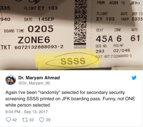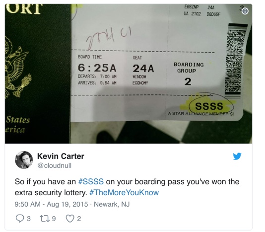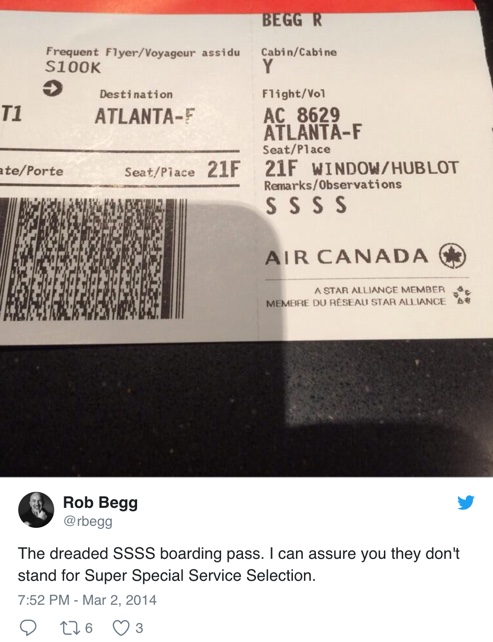 Það er eðlilegt að fá „SSSS“ kóðann öðru hverju á brottfararspjaldið en ef þetta gerist oftar en þú telur eðlilegt gætir þú verið á vöktunarlista vegna mistaka. Þú gætir haft samband við Traveler Redress Inquiry Program ef þú þarfnast frekari upplýsinga.