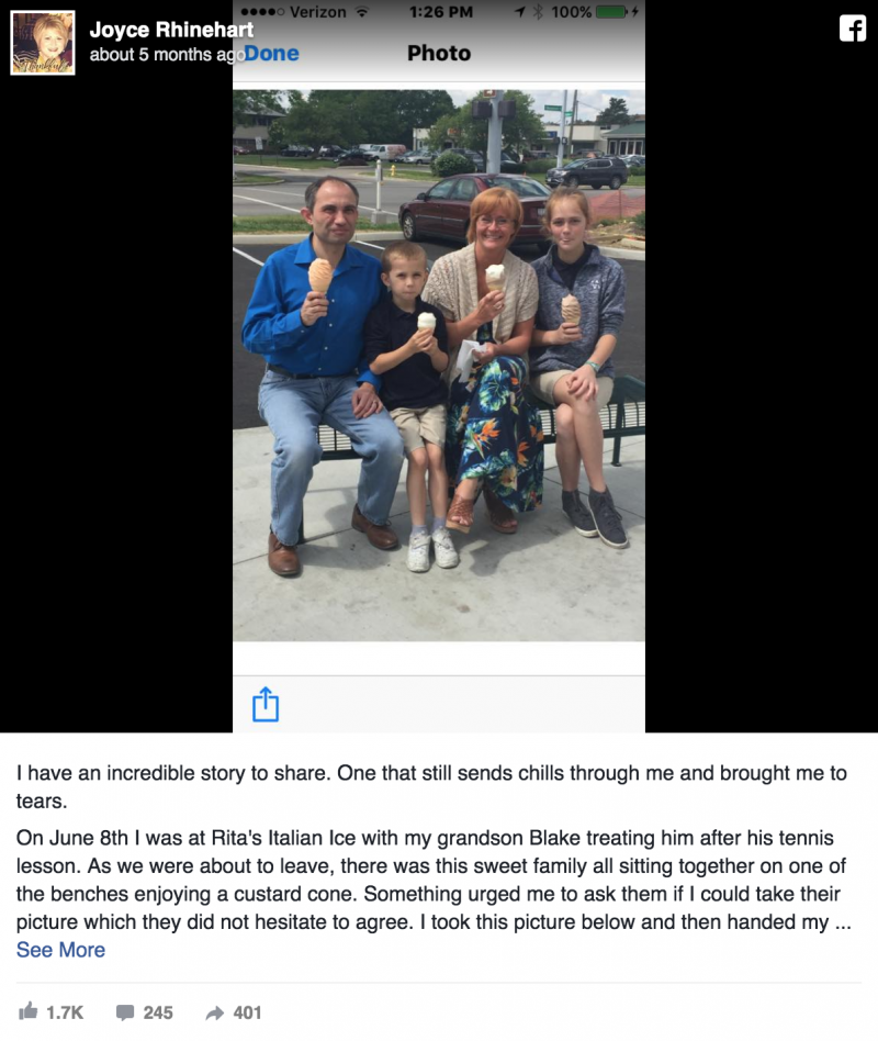 Í þessu tilfelli var það einmitt svo. Joyce Rhinehart í Columbus, Ohioríki í Bandaríkjunum var úti með barnabarninu sínu einn síðsumardag. Hún ákvað að bjóða honum upp á ís eftir tennisæfingu. Þegar þau voru við það að fara sá hún glaðværa fjölskyldu vera einnig að fá sér ís. Hún ræddi við þau og spurði hvort hún ætti að taka mynd af þeim.