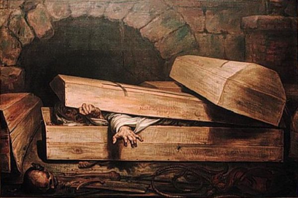 Kona sem var ranglega greind látin í Rússlandi vaknaði upp úr meðvitundarleysi á útfarardaginn. Sú vitneskja að átta sig á að hún var í raun í líkkistu og hún vissi að grafa ætti hana lifandi lét hana öskra svo klukkutímum skipti. Enginn heyrði í henni og hún fékk hjartaáfall og lést á þann hryllilega hátt.