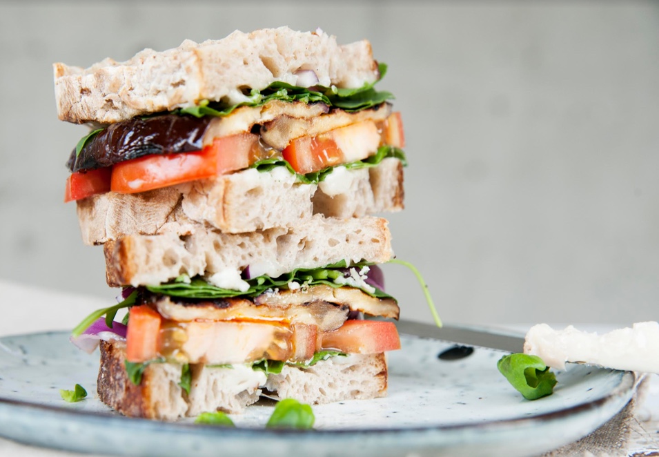 4.  Smyrjið tvær súrdeigsbrauðsneiðar með osti. Raðið á aðra sneiðina: ferskri basilíku, tómatsneiðum, rauðlauk, grilluðu eggaldin, klettasalati og lokið samlokunni.
