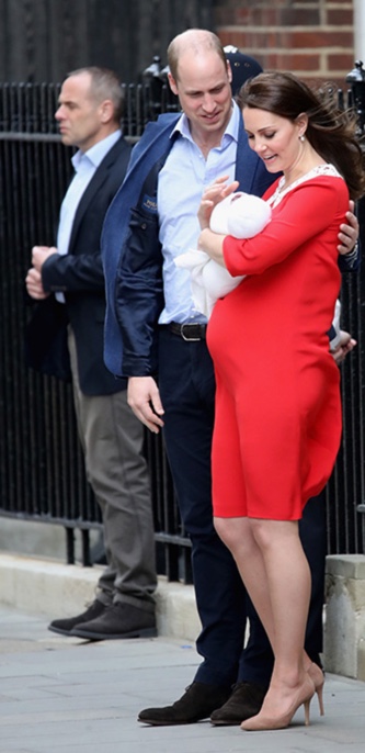 Kate, sem var í rauðum Jenny Packham kjól, leit afskaplega vel út og hreinlega ljómaði með pínulitla prinsinn í fanginu. Vilhjálmur hélt utan um konu sína og var greinilega stoltur líka. Stóru systkinin höfðu komið í dag að hitta hann og má lesa um það HÉR.