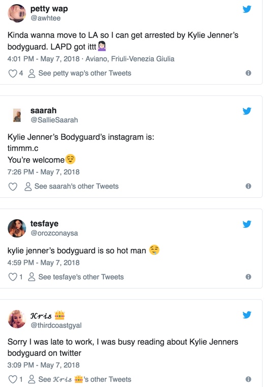 „Góðan daginn,“ sagði einn. „Þetta er Tim Chung, lífvörður Kylie Jenner,“ sagði einn notandi ásamt myndum af honum. „Hver er þessi lífvörður hennar og AF HVERJU ERT HANN SVONA FLOTTUR?“ sagði annar.