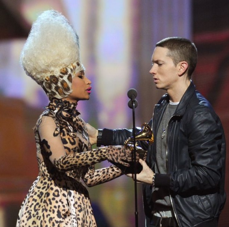 Nicky sagði í fyrra að hún ætlaði að vera skírlíf, en hún er greinilega búin að skipta um skoðun. Þau eiga sér sögu, ekki rómantíska þó, en hann kemur fram í nýjasta lagi hennar Big Bank ásamt þeim YG, 2 Chainz og Big Sean. Í laginu má heyra þessar línur: „Uh oh/Back again/Back to back Maybach, stack the M’s/Told em’ I met Slim Shady, bag the M/Once he go black, he’ll be back again.“