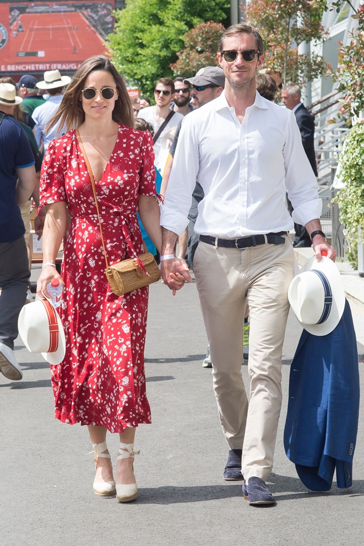 Systir Kate, Pippa Middleton, er með barni! Pippa (34) fór með eiginmanni sínum James Matthews (42) til Parísar á laugardaginn síðasta 26. maí til að fylgjast með opna franska meistaramótinu í tennis sem haldið var í Roland Garros leikvanginum í París. Var hún í kjól sem sýndi vel afar sæta óléttubumbu.