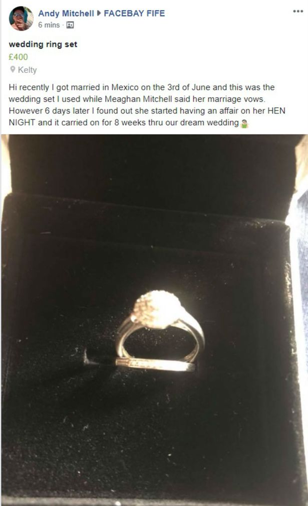 „Hæ, ég gifti mig nýlega í Mexíkó og þetta er trúlofunarhringurinn sem ég notaði meðan Meaghan Mitchell fór með heitin sín. Sex dögum síðar komst ég að því að hún hóf annað samband í gæsaveislunni sinni og hélt því áfram í átta vikur fram að brúðkaupinu.“
