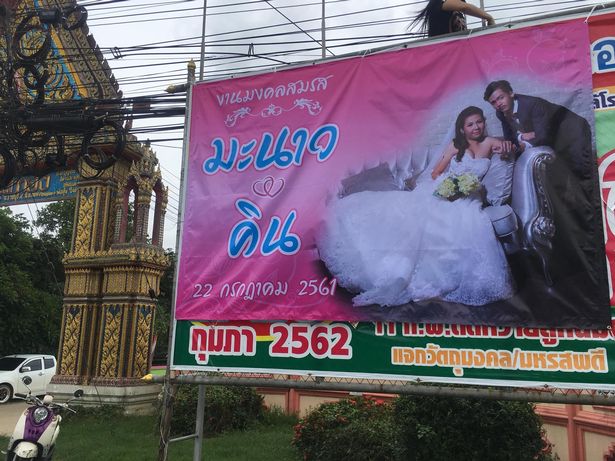 Um þúsund manns var boðið í brúðkaupið og höfðu þau einnig keypt risastór auglýsingaskilti af þessu hátíðlega tilefni.