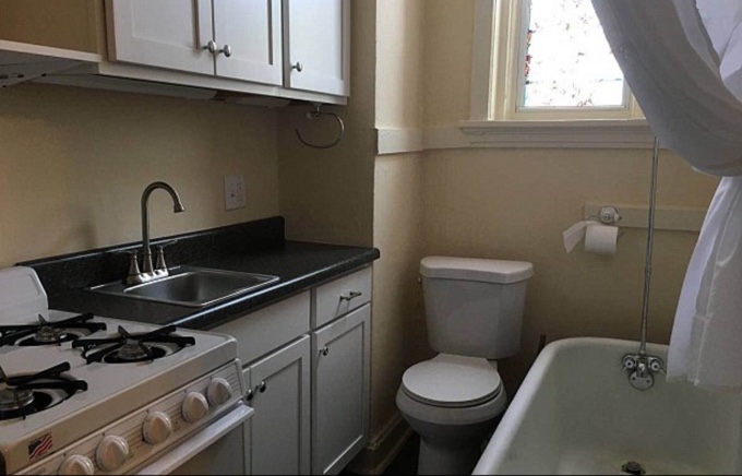 Leigusalinn sem staðsettur er í St Louis vill fá tæplega 60 þúsund ISK á mánuði í leigu. Semsagt – salernið er staðsett í eldhúsinu. Já – þar sem maturinn er eldaður.