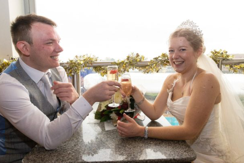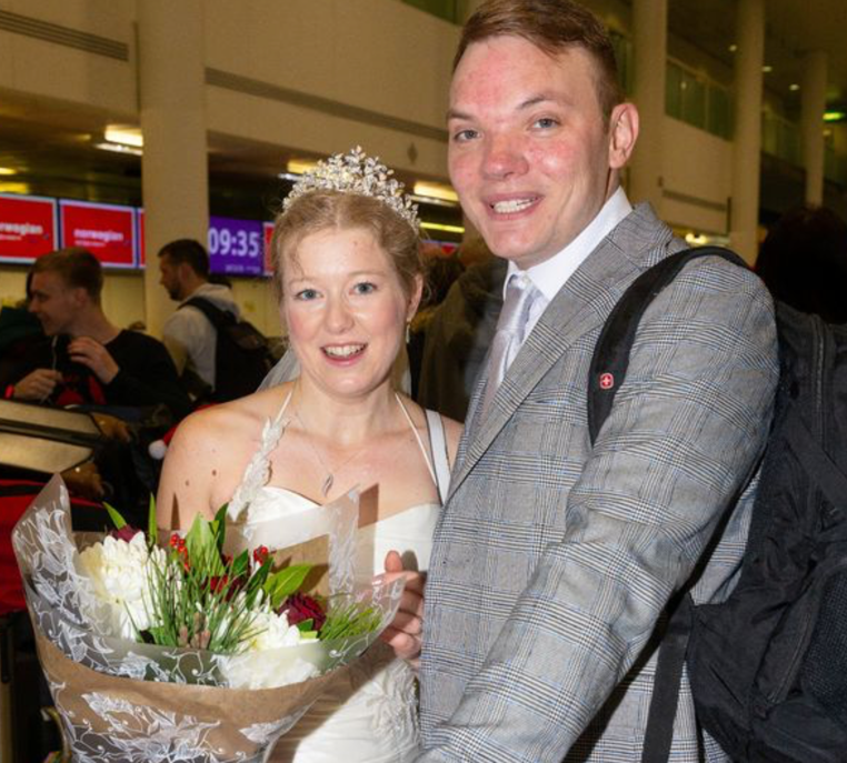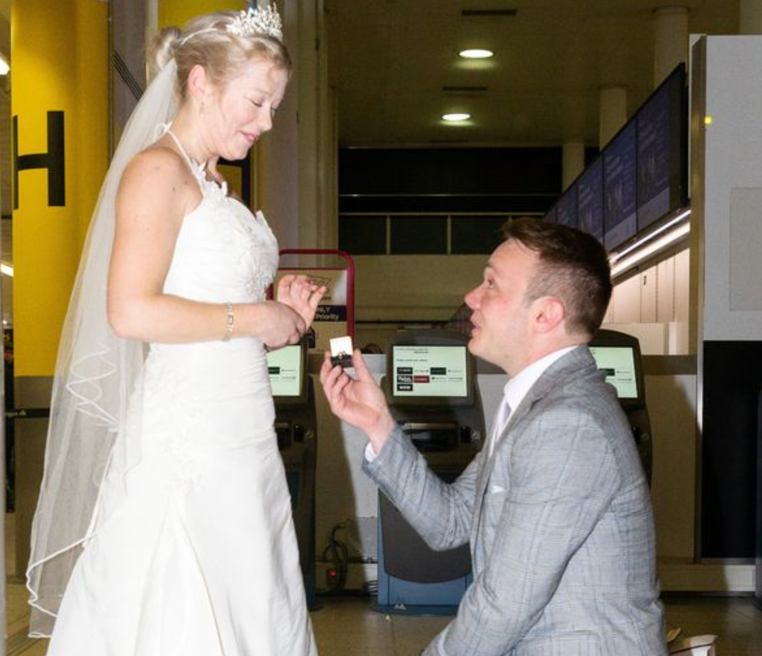 Þegar þau hittust í fyrsta sinn var það á Gatwick flugvellinum á aðfangadag. Þau fóru um borð í vélina í fullum brúðkaupsskrúða og héldu til Las Vegas.