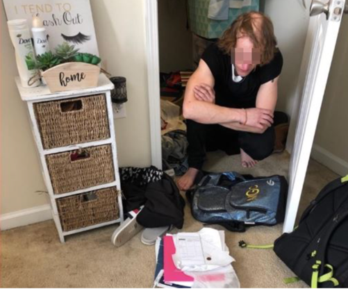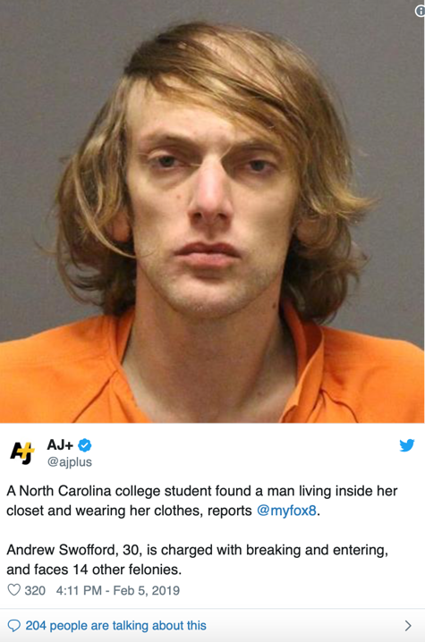Stúdína í Norður-Karólínuríki hélt að reimt væri í íbúðinni hennar eftir að hlutir fóru að hverfa. Hún fékk áfall þegar hún uppgötvaði að ókunnur maður væri að fela sig í skápnum hennar og klæddist fötunum hennar.