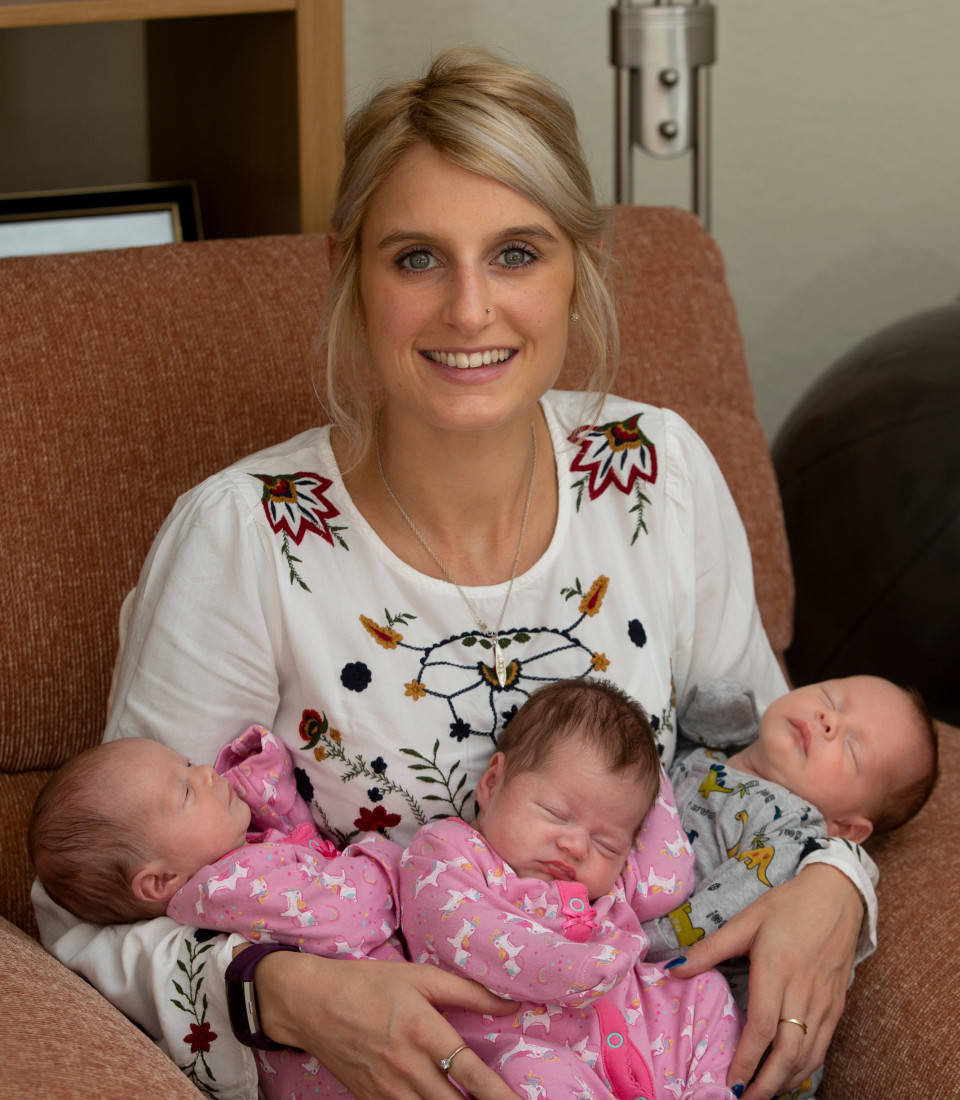 Hannah hélt henni hefði misheyrst: „Hvernig gátu verið tvö börn þarna inni?“ og svo sagði læknirinn: „Og þarna heyri ég þriðja hjartsláttinn!“ Hannah gapti bara og hélt hann væri að grínast. Svo sá hún þrjá hjartslætti á skjánum: „Ég trúði þessu ekki. Ben ekki heldur. Ég ætlaði ekki að eignast eitt barn í viðbót, hvað þá þrjú!“