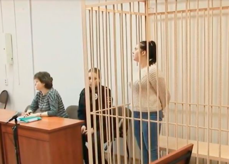 Sést Maria á myndbandi í búri fyrir rússneskum dómi þar sem hún talar rólega, hvíslar næstum en brotnar aldrei niður.