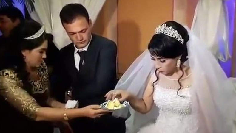 Þvílíkur hryllingur! Brúðgumi löðrungaði brúði sína harkalega fyrir framan skelfingu lostna brúðkaupsgesti eftir að hún þóttist ekki ætla að gefa honum bita af brúðartertunni.