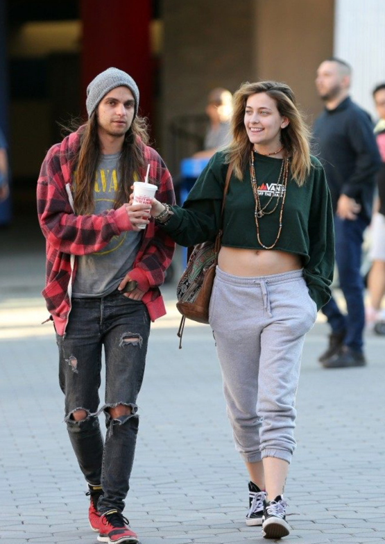 Hin tvítuga Paris var í gráum jöggingbuxum, stuttermabol og var í góðu skapi, að minnsta kosti af myndunum að dæma. Þau skiptust á drykk og nutu lísfins.