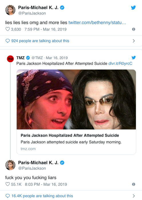 Paris Jackson hefur neitað því að hafa reynt sjálfsvíg, en lögreglan staðfestir að hún hafi skorið sig á púls. Hún var lögð inn á spítala en er komin út. Síðdegis á laugardeginum, 16. mars síðastliðinn, sást hún úti með kærastanum Gabriel Glenn í Universal City, Los Angeles.