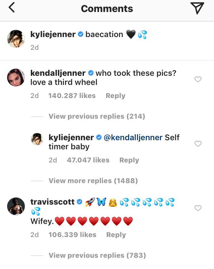 Systir Kylie, Kendall Jenner skrifaði ummæli við myndina og spurði hver hafði tekið myndina. „Hver tók þessar myndir? Ég elska þriðja hjólið’’. Scott skrifaði einnig á myndina „konan mín.’’
