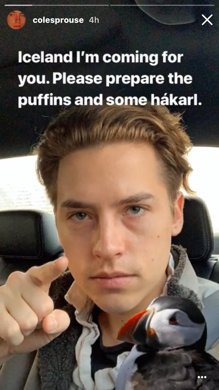 Cole Sprouse sem þekktastur er fyrir leik sinn í þáttunum Riverdale og Disney Channel þáttunum The Suit Life Of Zack and Cody, birti á Instagram fyrr í dag að hann væri að koma til Íslands og vildi að íslendingar hefðu til fyrir sig fyrir sig lunda og dálítið hákarl þegar hann kæmi.