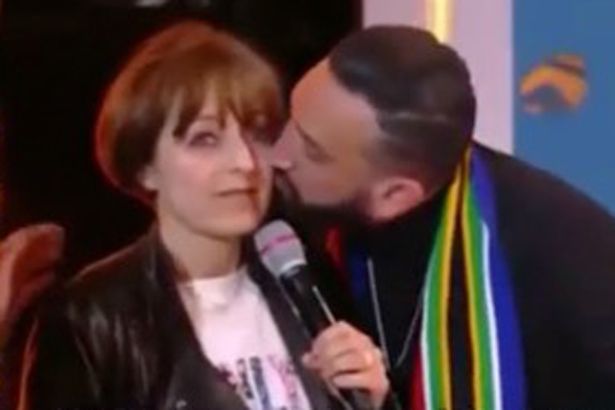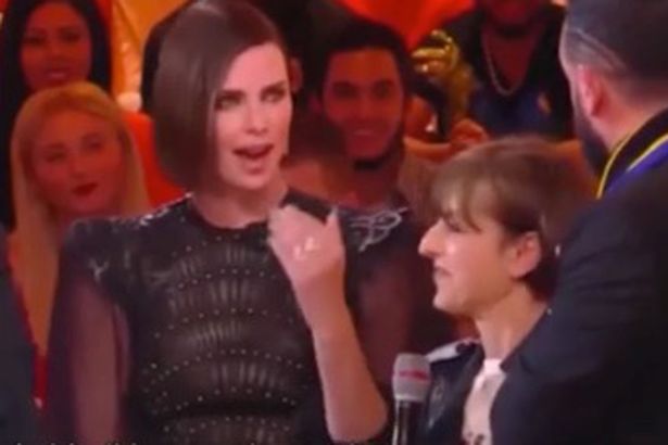 Charlize Theron varð sjáanlega misboðið þegar að franskur sjónvarpsmaður kyssti þýðanda hennar í mjög vandræðilegu viðtali. Hún var að spjalla við kynninn í ásamt Seth Rogan með hjálp konu að nafni Nadia sem var þýðandi hennar í viðtalinu og allt í einu tók viðtalsmaðurinn Hanouna upp á því að kyssa hana upp úr þurru.