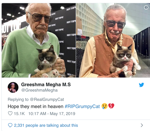 Hið heimsfræga andlit var uppspretta margra memes og urðu eigendurnir afar fjáðir vegna alls kyns varnings í nafni Grumpy Cat og einnig bíómyndar.