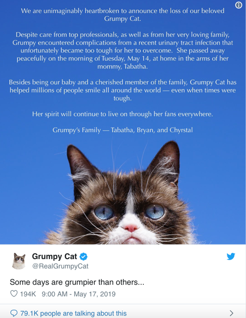 Ein vinsælasta uppspretta meme á undanförnum árum, Grumpy Cat, er kominn yfir móðuna miklu. Þessi fýldi, en æðislegi kisi varð bara sjö ára gamall. Orsök grettunnar á andliti hans var vegna fæðingargalla.