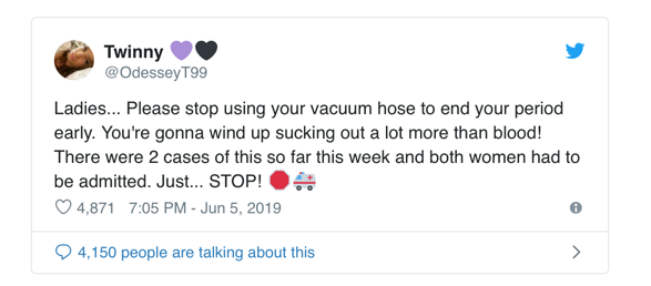 Já, þú last þetta rétt. Hjúkrunarfræðingur fór á Twitter og bað konur – náðarsamlegast – að gera það ekki, þar sem hún hafði þurft að eiga við TVÖ slík tilfelli í vikunni.