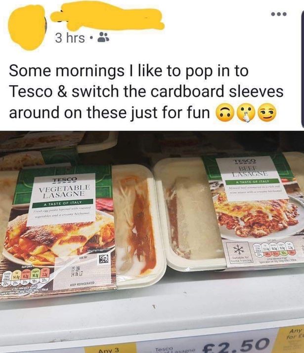 Margir urðu ævareiðir þegar ónefndur aðili játaði að skemmta sér stundum við að breyta merkingum á grænmetislasagna og kjötlasagna í matvörubúðinni. Montaði hann sig af þessu á Facebookgrúppu í pósti þar.