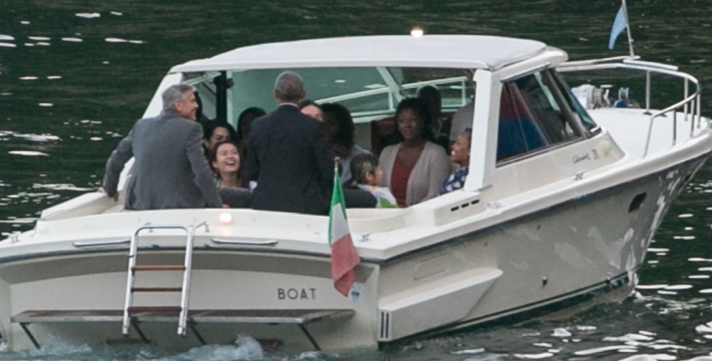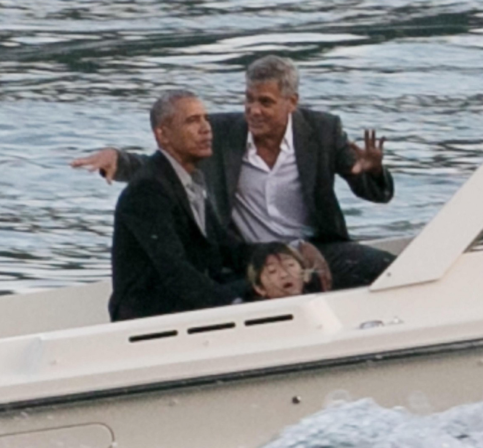 Fyrrum Bandaríkjaforsetinn Barack Obama og Hollywoodleikarinn George Clooney virðast vera fínir vinir, ef marka má myndir sem birtust af þeim við Como vatn á Ítalíu, sunnudaginn 23. júní.