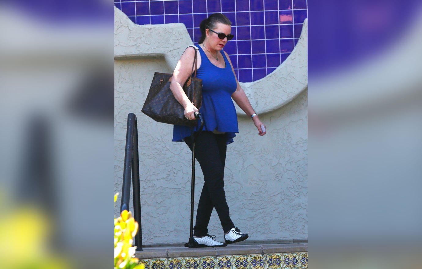 Karen Houghton (61) sást með hækju staulast til læknis ein til að fá ráð við verkjum og sækja lyf. Hún kemst lítið út og hefur oft verið föst í rúmi sínu vikum saman.
