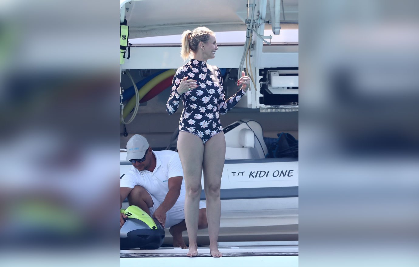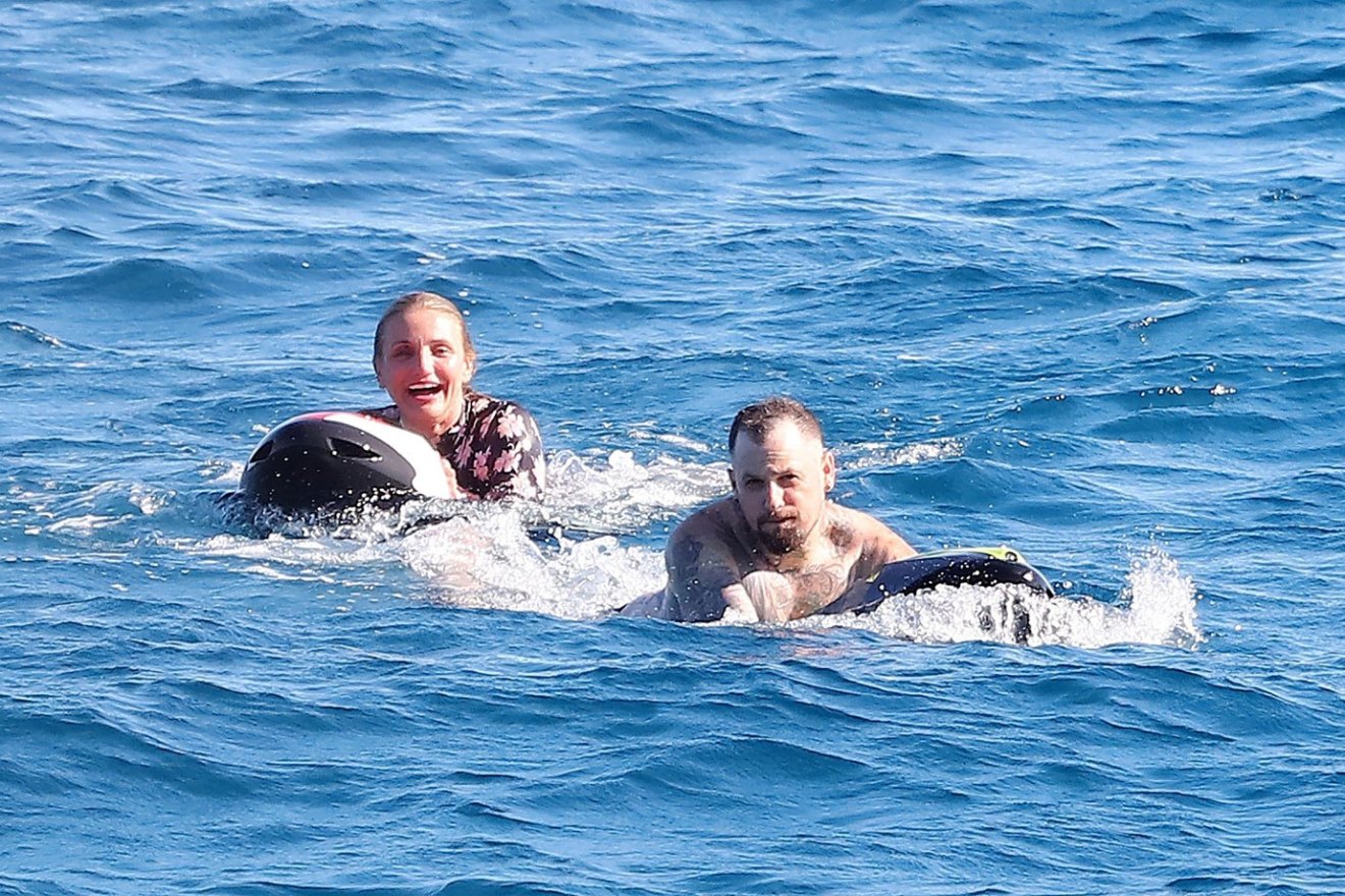 Leikkonan Cameron Diaz sýndi óvenjulegt lúkk fyrir Hollywoodstjörnu að vera, en hún stakk sér í sjóinn í St. Tropez í þessari viku. Var hún í langerma sundbol með blómamynstri. Sást til hennar ásamt eiginmanninum Benji Madden, en þau virðast afar ástfangin og hamingjusöm.