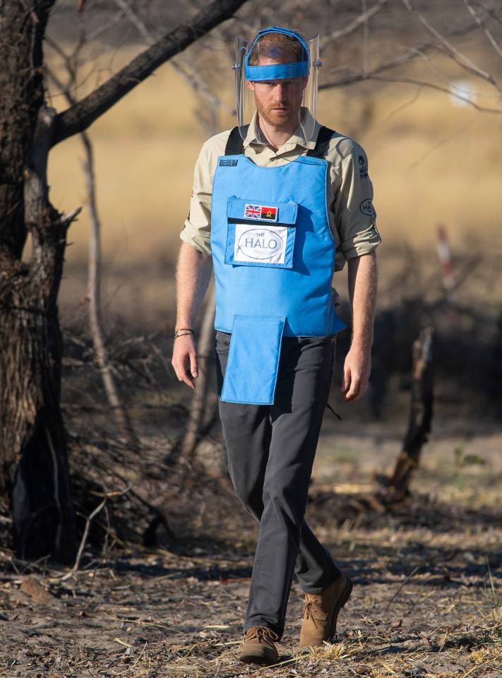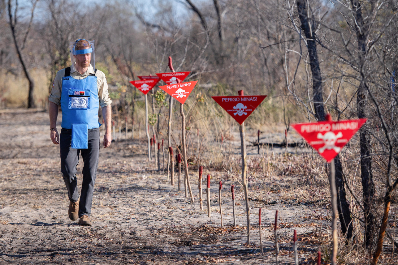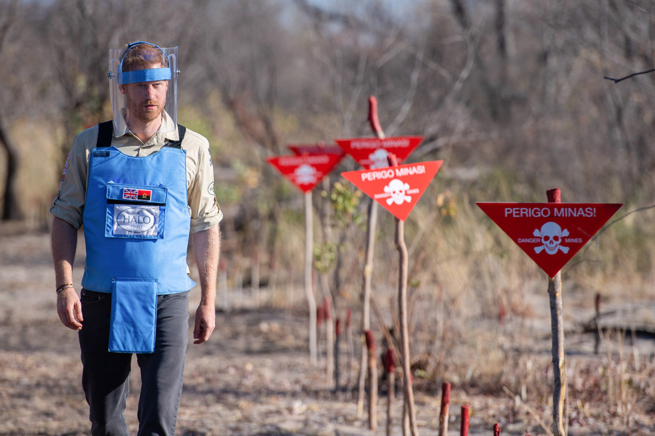 „Jarðsprengjur eru ógróið sár stríðsins,“ sagði Harry í bænum Dirico þar sem hann aftengdi sprengju úr fjarlægð. „Með því að hreinsa þessar sprengjur getum við hjálpað samfélaginu að finna frið, og með friði koma tækifærin.“