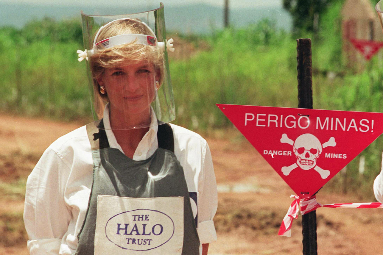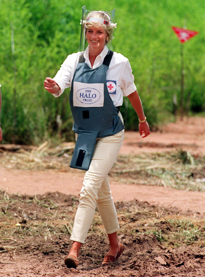 Harry Bretaprins fetaði í fótspor Díönu heitinnar, en hún heimsótti jarðsprengjusvæði í Angóla nokkrum mánuðum áður en hún lést, fyrir rúmum tveimur áratugum. Var hann í samskonar hlífðarfatnaði og hún en myndirnar eru ákaflega keimlíkar.